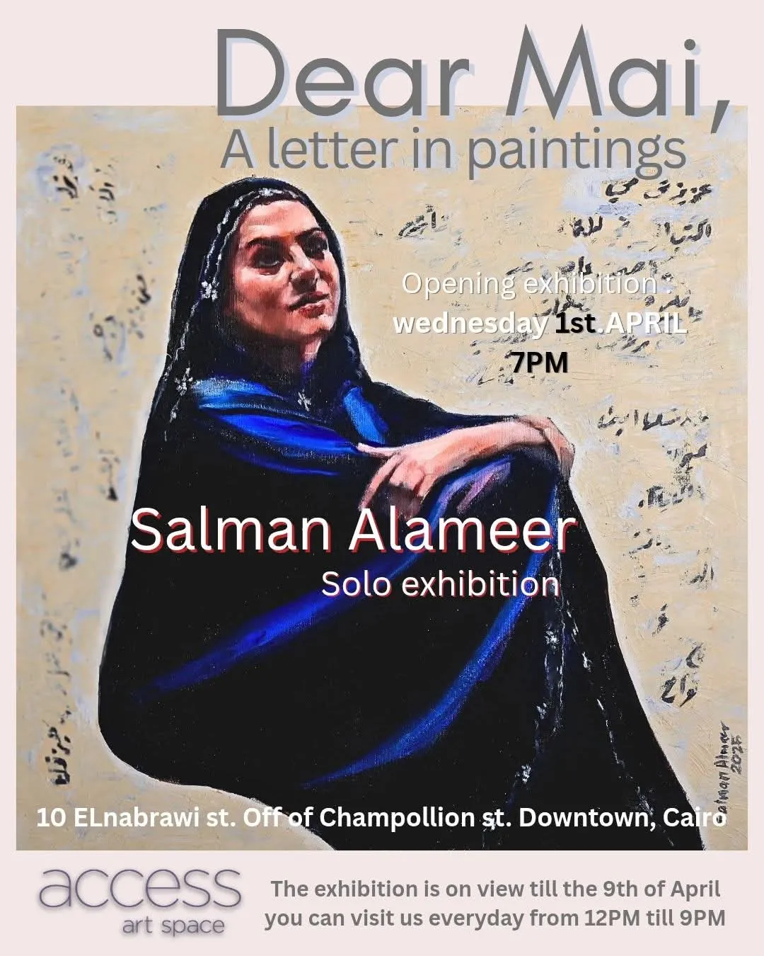 المعرض مستمر ليوم ٩ ابريل. مواعيد العمل : كل يوم من الساعة ١٢م ل ٨:٣٠م ، ما عدا الأحد. العنوان : ١٠ ش. النبراوي المتفرع من ش. شامبليون ، وسط البلد القاهرة