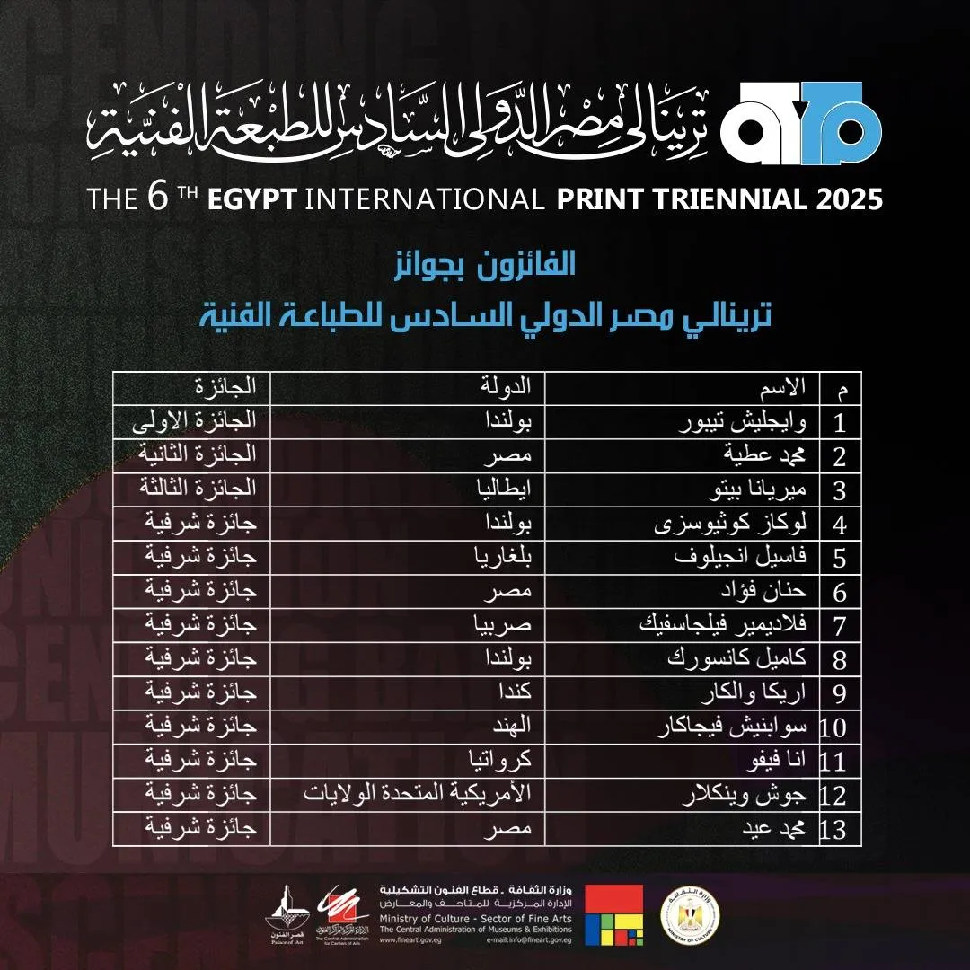 Under the slogan "Communication and Overcoming Barriers," the sixth edition of the Egypt International Art Triennale will open next Tuesday. The Fine Arts Sector announces the return of the Egypt International Art Triennale, after a nineteen-year absence. The opening ceremony will be attended by Dr. Ahmed Fouad Heno, Minister of Culture, and will be attended by Dr. Walid Qanoush, Head of the Sector, and members of the International Jury, headed by Dr. Ahmed Nawar, along with several ministry leaders and ambassadors of participating countries. The event will take place at 5:00 PM on Tuesday, April 15, 2025, at the Palace of Arts in the Cairo Opera House Square. Over 200 artists representing 33 countries will participate in the upcoming sixth edition, showcasing approximately 350 artworks. The upcoming edition will also honor seven prominent artists in the field of engraving: Magdy Kenawy, Magdy Abdel Aziz, Medhat Nasr, Awad El-Shemy, Abdel Wahab Abdel Mohsen, Salah El-Meligy, and Hamdy Abu El-Maati. On this occasion, Dr. Wael Abdel Sabour, General Commissar of the Triennale, and Dr. Hani Al-Ashqar, Commissar of the Egyptian Pavilion, are honored to invite artists, critics, and the public to attend the opening.