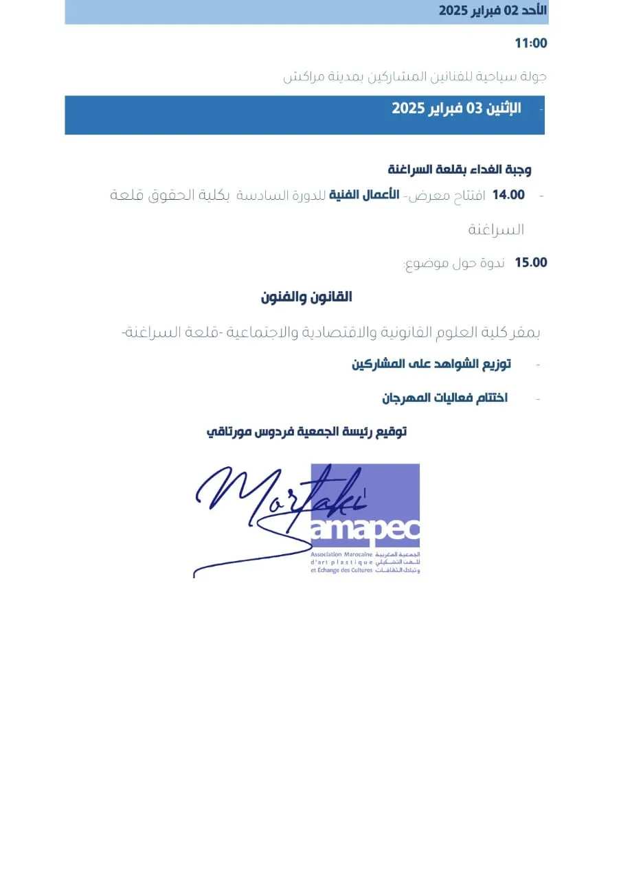 Friday, January 31, 2025 Reception of participants 11:00 Visit the photo exhibition in the exhibition hall of the House of Culture - Sidi Rahal Under the title - Mirrors of Silence on the outskirts of Oued Ghedat. For photographers Saida Bouna and Rachid Mortaqi - City tour and attendance of an activity in the Moroccan art of Tbourida Lunch Premier screening of the documentary film on the city of Sidi Rahal - They say diversity enriches life - - Directed by German director Saffyan Mirza Saturday, February 1, 2025 10:00 In the city of Sidi Rahal Start of the mural workshop Start of the artwork workshops in the stones of Oued Ghadat Start of the drawing workshops for the participating artists 20.00 Second screening of the documentary film on the city of Sidi Rahal - They say diversity enriches life - In the open air for the city's residents - Directed by German director Saffyan Mirza Sunday, February 2, 2025 11:00 Tour for the participating artists in the city of Marrakech Monday, February 3, 2025 Lunch in Kelaat Sraghna 14.00 Opening of the sixth session of the artwork exhibition at the Faculty of Law Kelaat Sraghna 15.00 Seminar on the topic Law and Arts At the headquarters of the Faculty of Legal, Economic and Social Sciences - Kelaat Sraghna Distribution of certificates to participants Closing of the festival activities Signature of the association president Fardous Mortaki