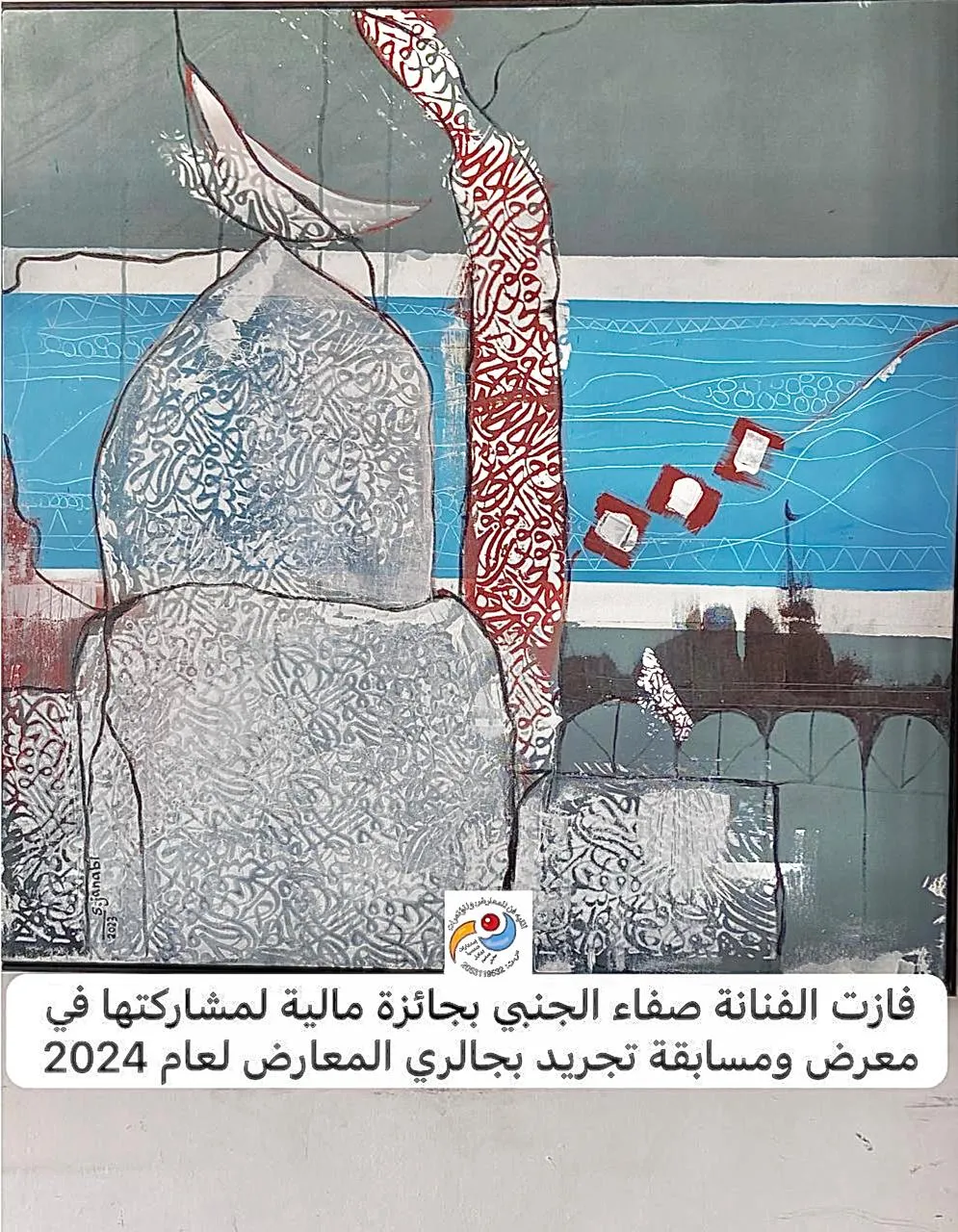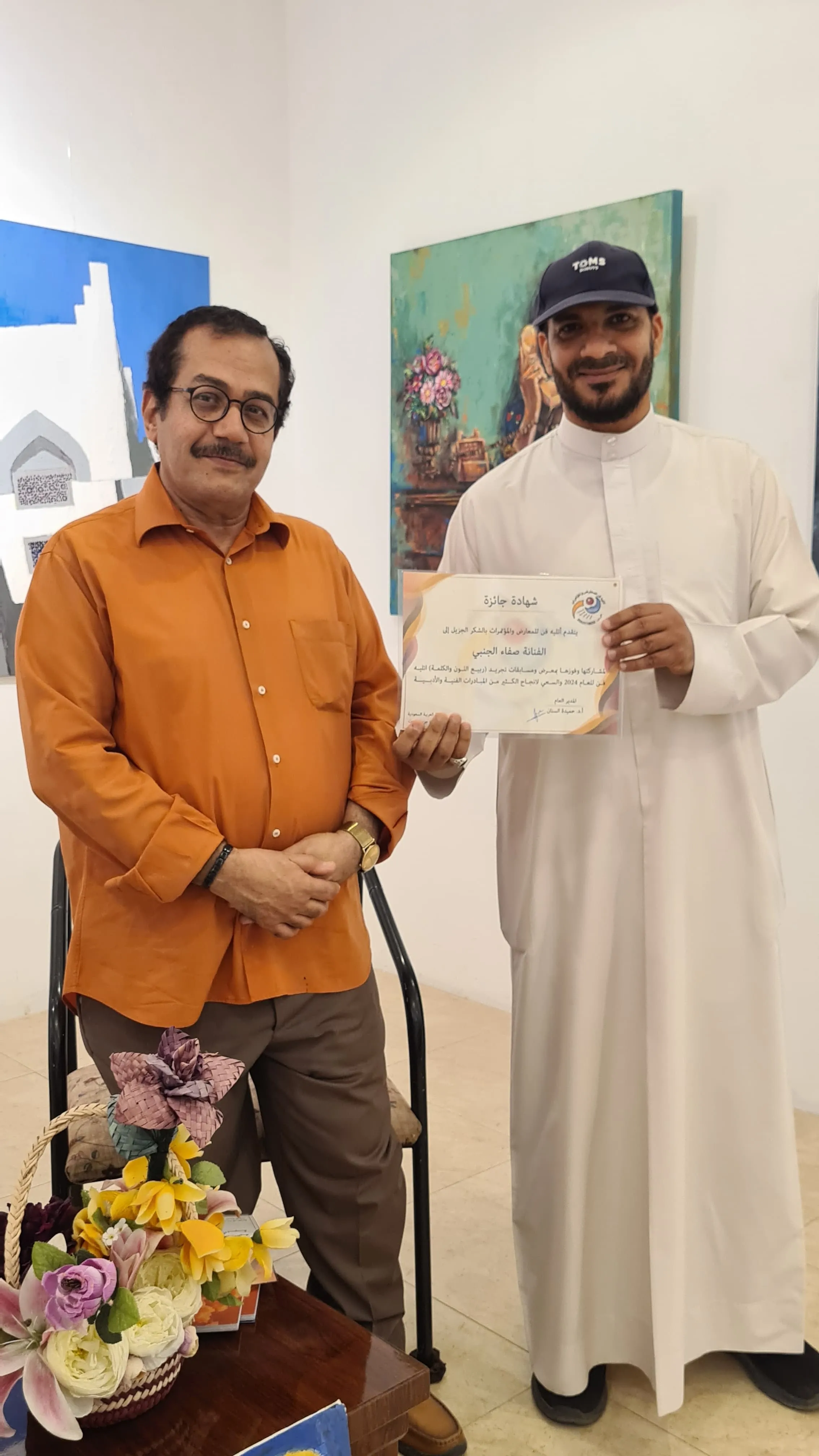 Honoring the artist Khadija for winning second place in an abstraction competition by the writer and artist Adel Gad in the Exhibition Gallery.