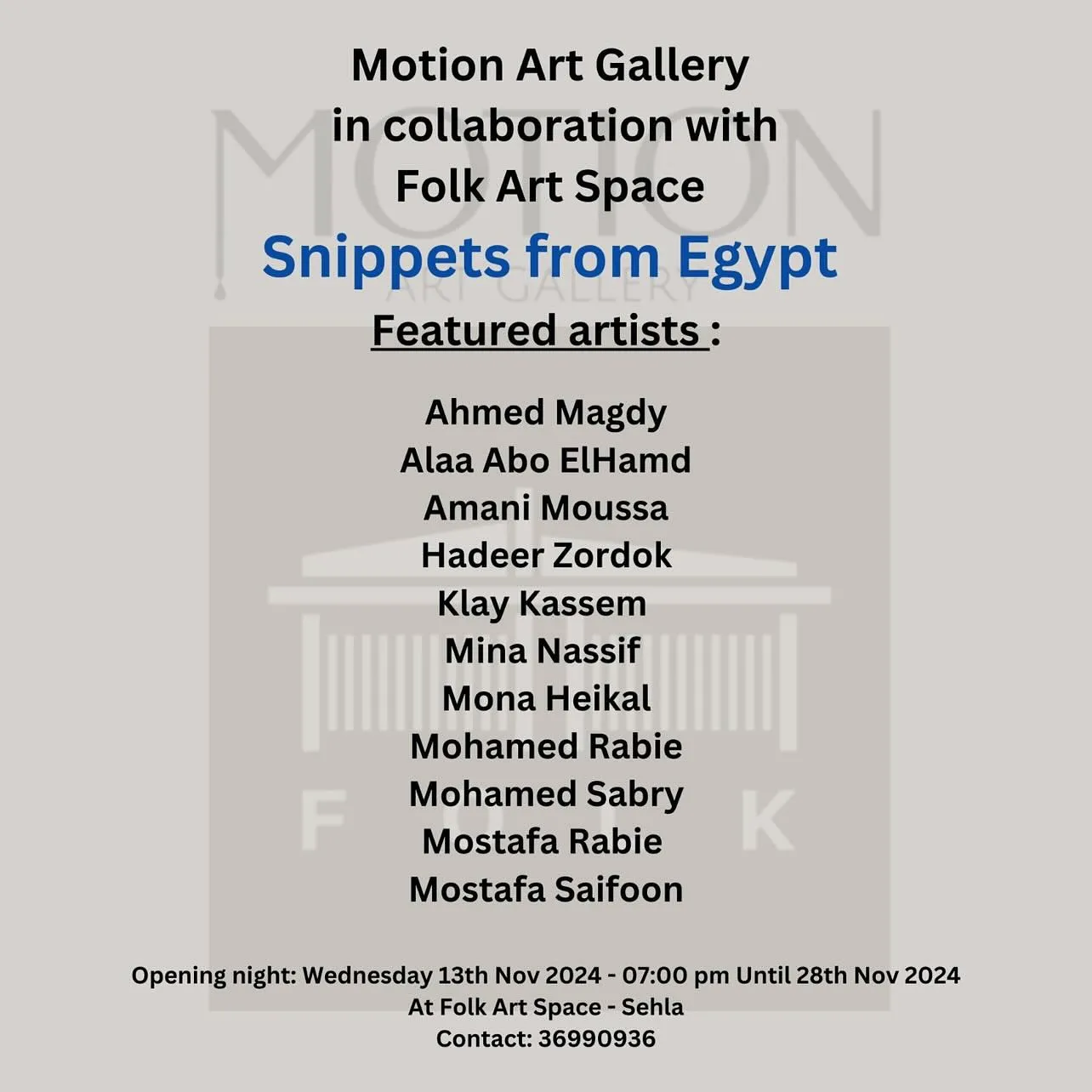 . برعاية كريمة من سعادة السيدة ريهام خليل سفير جمهورية مصر العربية لدى مملكة البحرين تسر فضاء فولك للفنون و موشن جاليري دعوتكم لحضور افتتاح معرض “قصاصات” قصاصات Snippets from Egypt لمجموعة مختارة من فنانين جمهورية مصر العربية قيم المعرض بشرى شبر @bushrahussainshubbar وذلك يوم الأربعاء الموافق ١٣ نوفمبر ٢٠٢٤ الساعة ٠٤:٠٠ عصراً لغاية 28 نوفمبر 2024 فضاء فولك للفنون - السهلة الفنانين @alaa_abuelhamd @klaykasem @mohamed.sabry.art @mg_zzzzz @mona.heikal @mrabie402 @mostafasaifoon @mostafa.rabe342 @minanassef1 @amani.mousa @haderzordok