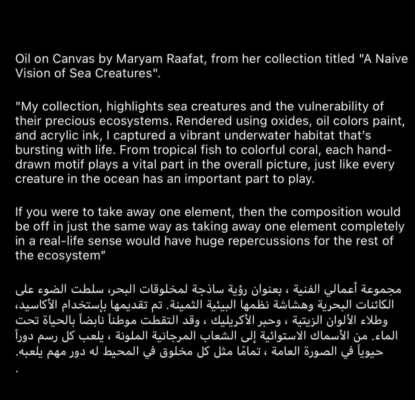 لوحة زيتية على قماش للفنانة مريم رأفت من مجموعتها "رؤية ساذجة لمخلوقات البحر". "تسلط مجموعتي الضوء على الكائنات البحرية وضعف أنظمتها البيئية الثمينة. تم عرضها باستخدام الأكاسيد والطلاء بالألوان الزيتية والحبر الأكريليكي، وقد قمت بالتقاط موطن نابض بالحياة تحت الماء ينبض بالحياة. من الأسماك الاستوائية إلى المرجان الملون، يلعب كل شكل مرسوم يدويًا دورًا حيويًا في الصورة العامة، تمامًا مثل كل مخلوق في المحيط لديه دور مهم يلعبه. إذا قمت بإزالة عنصر واحد، فإن التركيبة ستكون معطلة بنفس الطريقة التي قد يكون بها إزالة عنصر واحد بالكامل بالمعنى الواقعي تداعيات هائلة على بقية النظام البيئي.