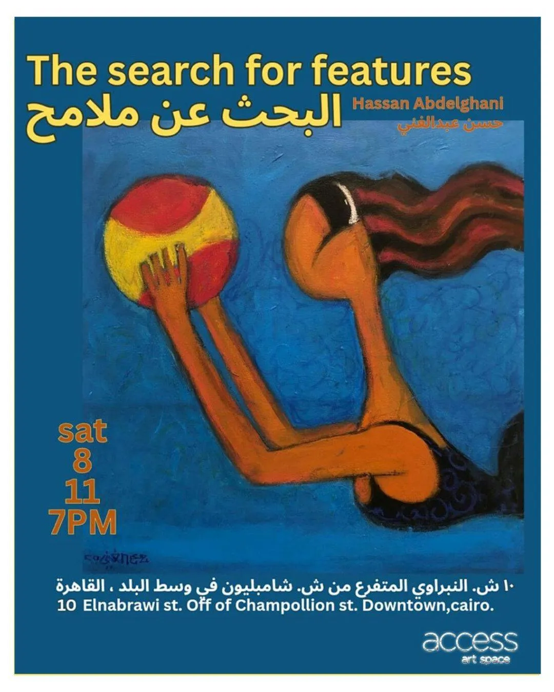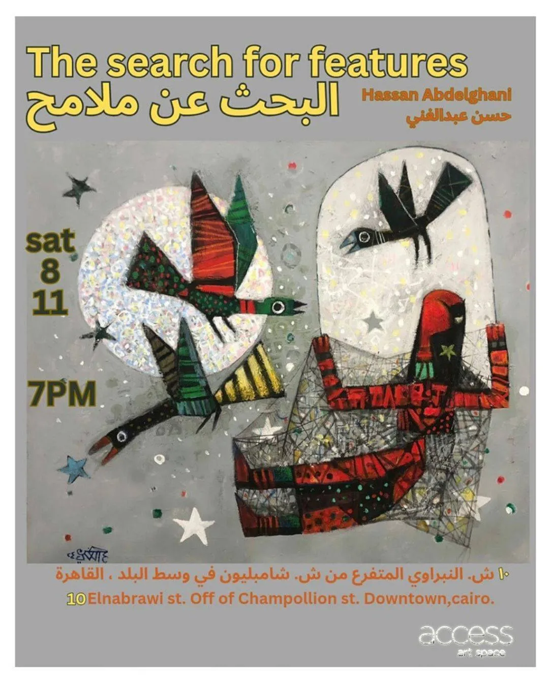 Access Art Space is pleased to invite you to the opening of Hassan Abdelghani’s latest exhibition, “In Search of Features” — an artistic journey that blends spontaneity and heritage, revealing the spirit of the artist through color, movement, and everyday details. Enjoy a vibrant visual experience that bridges the past and the present in a uniquely expressive style. Saturday, November 8th 7:00 PM 10 Elnabarawi St. Off of Champollion St. Downtown,cairo