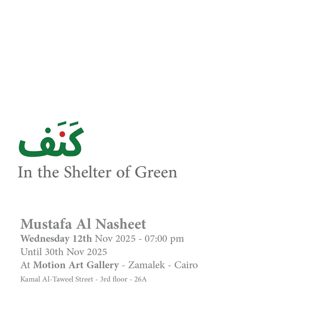 Folk Art Space in partnership with Motion Gallery From the Arab Republic of Egypt Invites you to the opening of The “Gnaf” exhibition by artist Mustafa El-Nashit In The Shelter of Green At Motion Gallery - Zamalek | Cairo Wednesday, November 12, 2025 - 7:00 PM until November 30, 2025 Motion Art Gallery - Cairo, Zamalek, Kamal El-Tawil Street - 3rd Floor - 26A