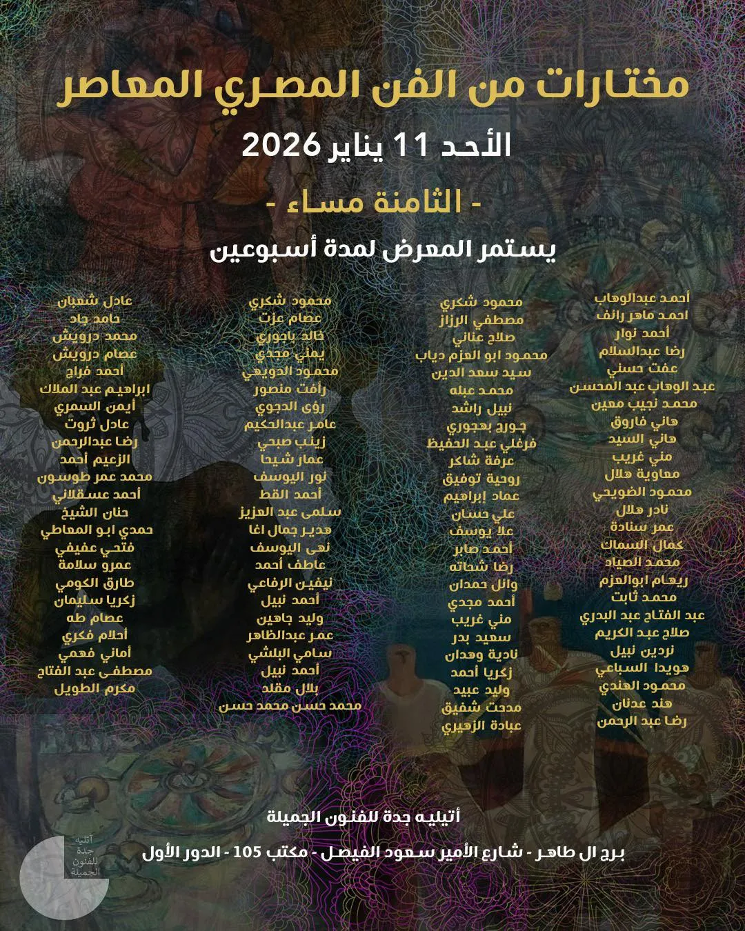 In honor of Engineer Louay Hakim, Jeddah Fine Arts Atelier is pleased to invite you to the opening of Selections from Contemporary Egyptian Art Sunday 8:00 PM January 11, 2026 The exhibition will run for two weeks Jeddah Fine Arts Atelier