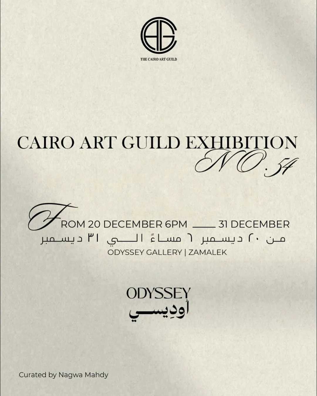 the 54th edition of the Cairo Art Guild exhibition, which will be held at Odyssey Gallery. The exhibition opens on Saturday, December 20, at 6:00 PM, and runs until December 31. All art lovers are warmly invited.