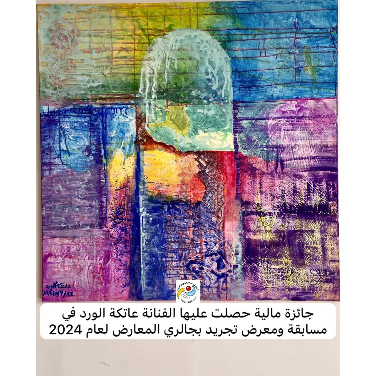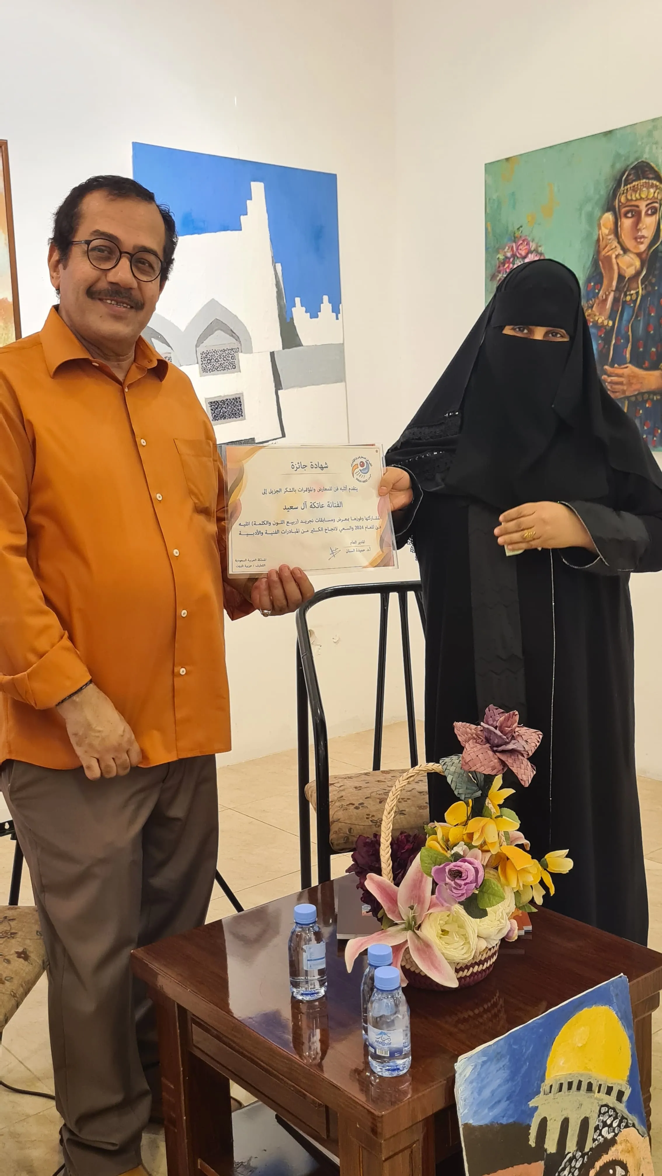 Honoring the artist Khadija for winning second place in an abstraction competition by the writer and artist Adel Gad in the Exhibition Gallery.